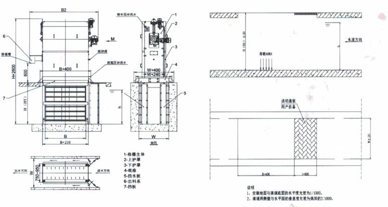 內(nèi)進(jìn)流網(wǎng)板格柵主要由主體框架、旋轉(zhuǎn)網(wǎng)板及鏈條、驅(qū)動單元、集渣槽、反沖洗系統(tǒng)和控制系統(tǒng)等組成。